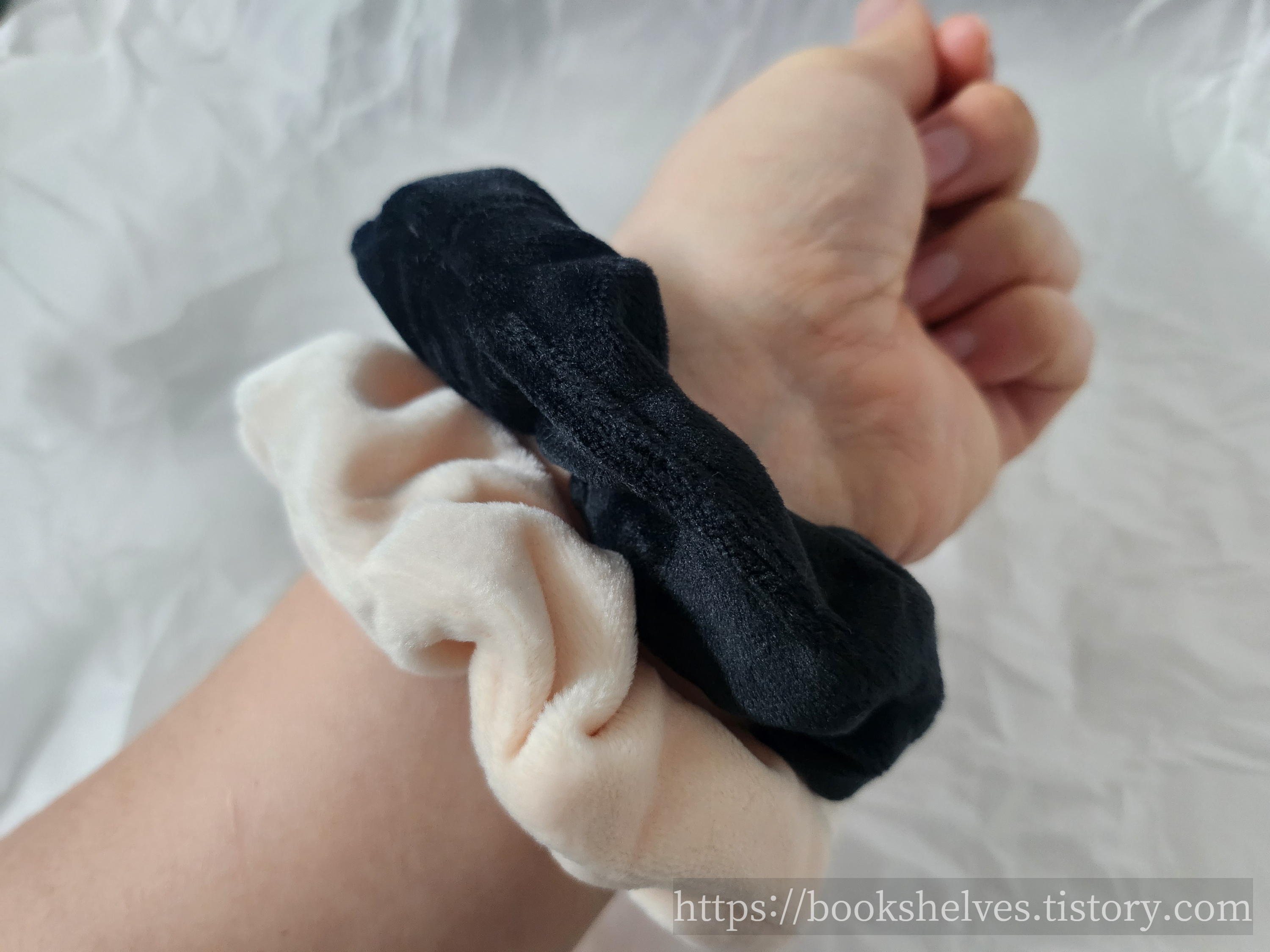 짜잔~^^ 색깔도 블랙과 살색이고, 샤넬 로고가 앙증맞은데 머리에 하면 당연히 안 보임. 부드러운 벨벳재질이다. 나는 머리숱이 많은데 두 번 묶으면 약간 짱짱한 느낌이다.